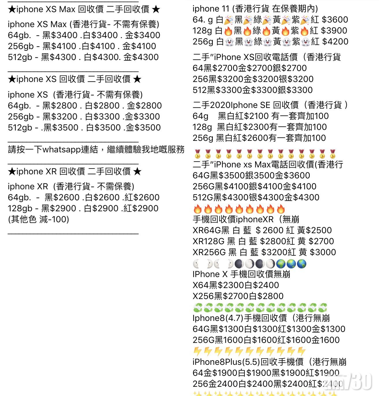 另一方面,網上報價128GB iPhone XR的回收價,由$2,900微跌至截稿時的$2,700-$2,800,256GB Xs由$3,200-$3,300則下跌至全部顏色劃一$3,200;反而256GB Xs Max沒受影響,仍企穩$4,100。