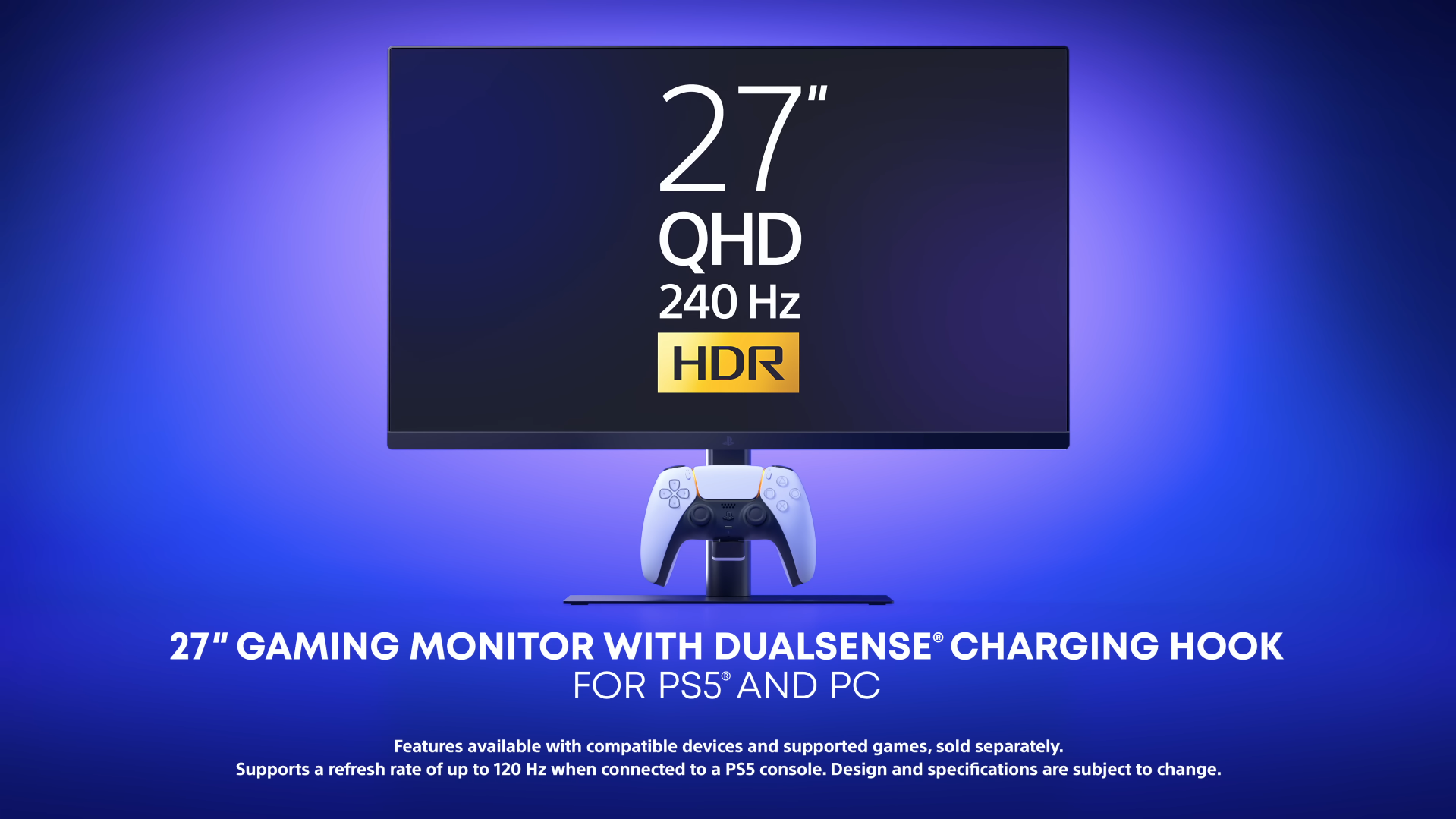 這款由SIE自家開發的全新27吋遊戲顯示器,為配備解析度2560 x 1440的QHD IPS顯示器。支援高動態範圍及具備自動HDR色調映射功能,支援VRR、120 Hz刷新率,相容的PC和Mac裝置支援240Hz。最特別是內建充電掛鉤,可連接DualSense無線控制器,同時支援VESA安裝及配備全套音訊和連接選項,將於2026年在美國和日本上市。