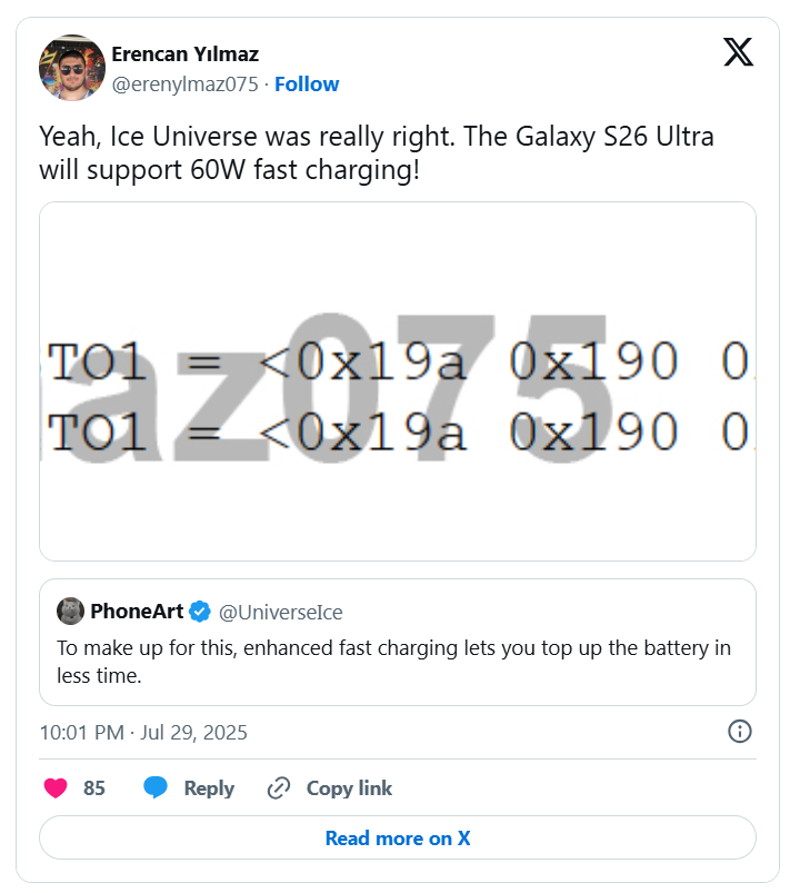 早前有傳聞指出,SAMSUNG即將推出的旗艦機Galaxy S26 Ultra將突破歷代45W有線快充的限制,升級至65W,讓不少用戶期待。然而,最新消息卻推翻這一說法。根據One UI 8系統代碼顯示,S26 Ultra可能僅支援60W有線充電,與傳聞中的65W稍有差距。