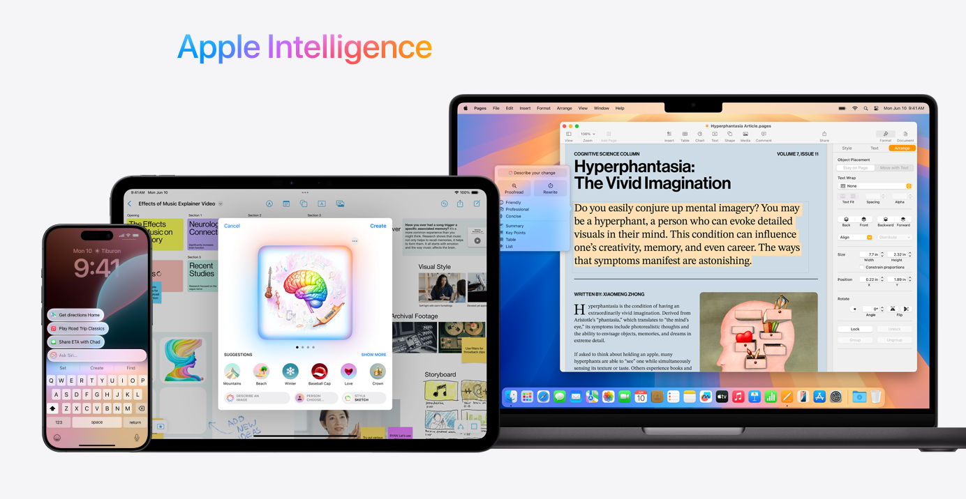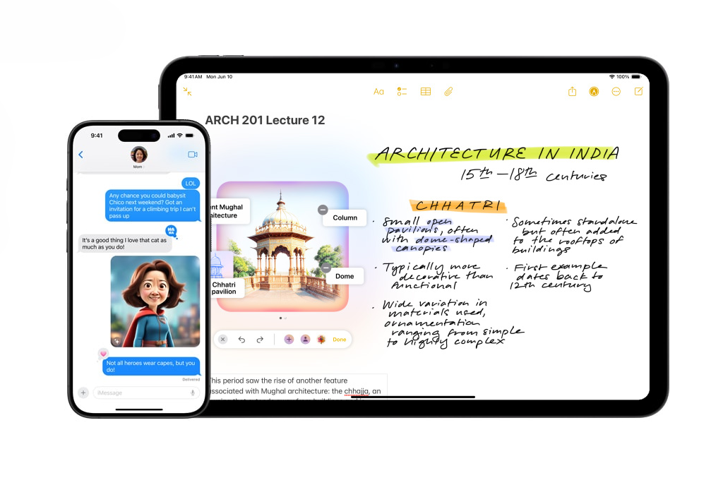 影像圖案方面,Image Playground讓用戶可以利用文字創作圖像,以及自家生成的Genmoji表情符號,Apple Intelligence亦會作出建議改良。Image Wand可以將粗略的繪圖變成一幅完整精美的圖像,只需用Apple Pencil或手指畫圓圈,即能利用旁邊的內容產生合適的配圖。