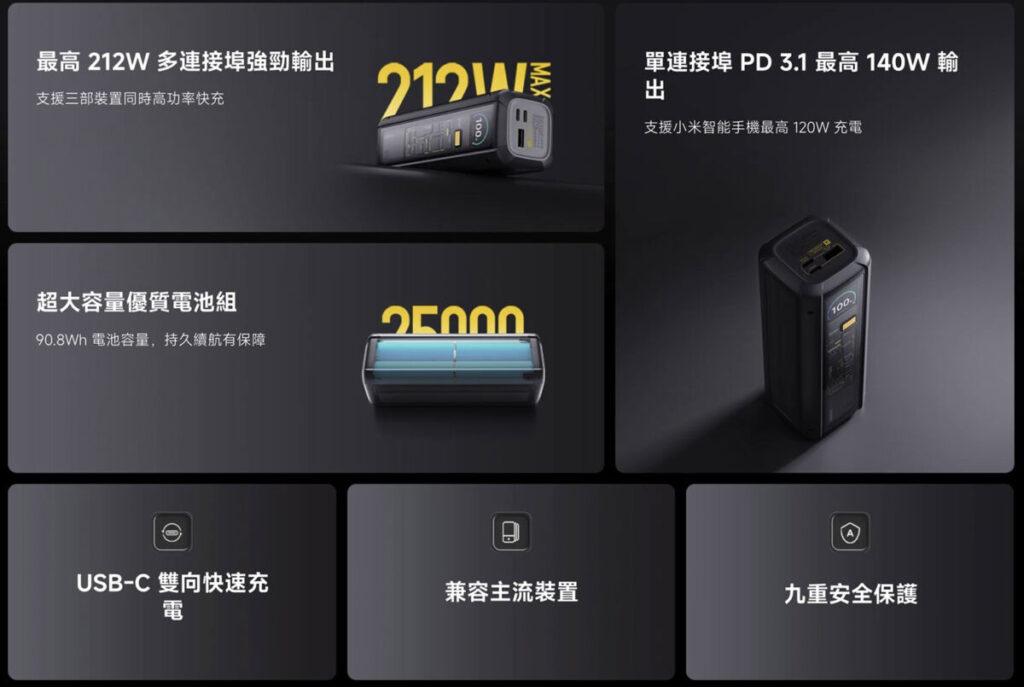 Xiaomi 行動電源 25000 212W 支援 65W+27W+120W 最大充電功率,單埠支援 PD3.1 協議 140W 輸出,滿足 MacBook Pro 需求。