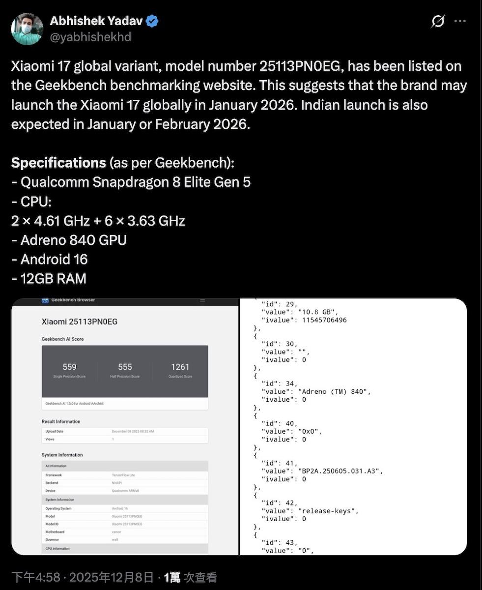 Xiaomi 17傳最快1月發布 現身GeekBench數據庫