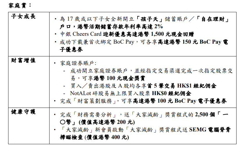 中銀香港指,中銀理財FamilyMAX家庭理財規劃方案包括不同的產品和服務,在「健康守護」方面,本行明白家庭客戶關注子女的健康及保障,特別配合客戶子女在不同階段的需要,提供包括壽險、醫療及傳承保障等多方面的保障方案。