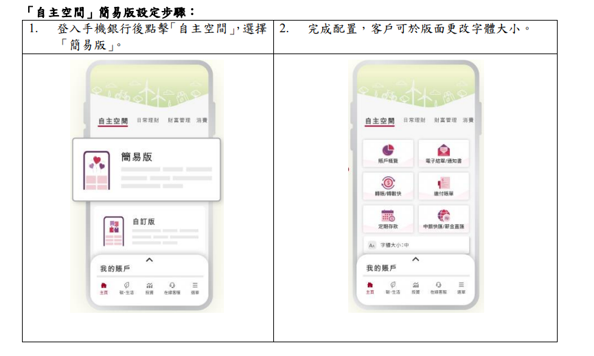 中銀香港表示,其手機銀行「自主空間」提供「自訂版」及「簡易版」自由選擇。「自訂版」 透過分析客戶的理財交易習慣,將功能分類。客戶只需回答數條簡單問題,手機銀行便會即時為他們智能配對合適的功能捷徑;客戶同時亦可按照喜好自由編輯捷徑組合,以配合其所需的理財功能。「簡易版」則以大數據分析及選出手機銀行六大常用功 能,自動配置於主頁。客戶更可於主頁更改頁面字體大小,清晰易用。此外,無論是 「自訂版」或「簡易版」,客戶均可於主頁一鍵進入「日常理財」、「財富管理」、「消費享樂」、「跨境」等理財頁面,毋須切換模式,操作靈活方便。