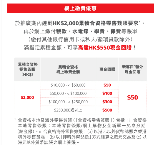 東亞銀行指,自現時起至2024年12月30日,客戶使用BEA Mall App進行登記,並在網上銀行內,使用東亞信用卡支付各種賬單(包括稅款、水電煤、學費、保險等),累計支付金額達到1萬港元,且在優惠期間內完成2,000港元的合資格零售消費,即可獲得最高550港元的現金回贈,相當於最高1%回贈率。條款受細則約束。瀏覽更多按此(東亞銀行官方網站)