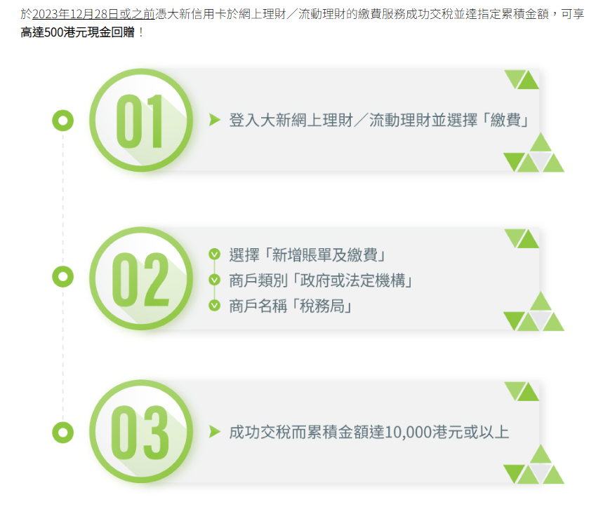 滙豐香港表示,於2023年11月27日至2024年2月29日,憑滙豐信用卡登記及於流動理財或網上理財交稅滿港幣3萬元,並累積簽賬滿6,000港元,可享以下交稅獎賞,賺取高達額外800元「獎賞錢」。