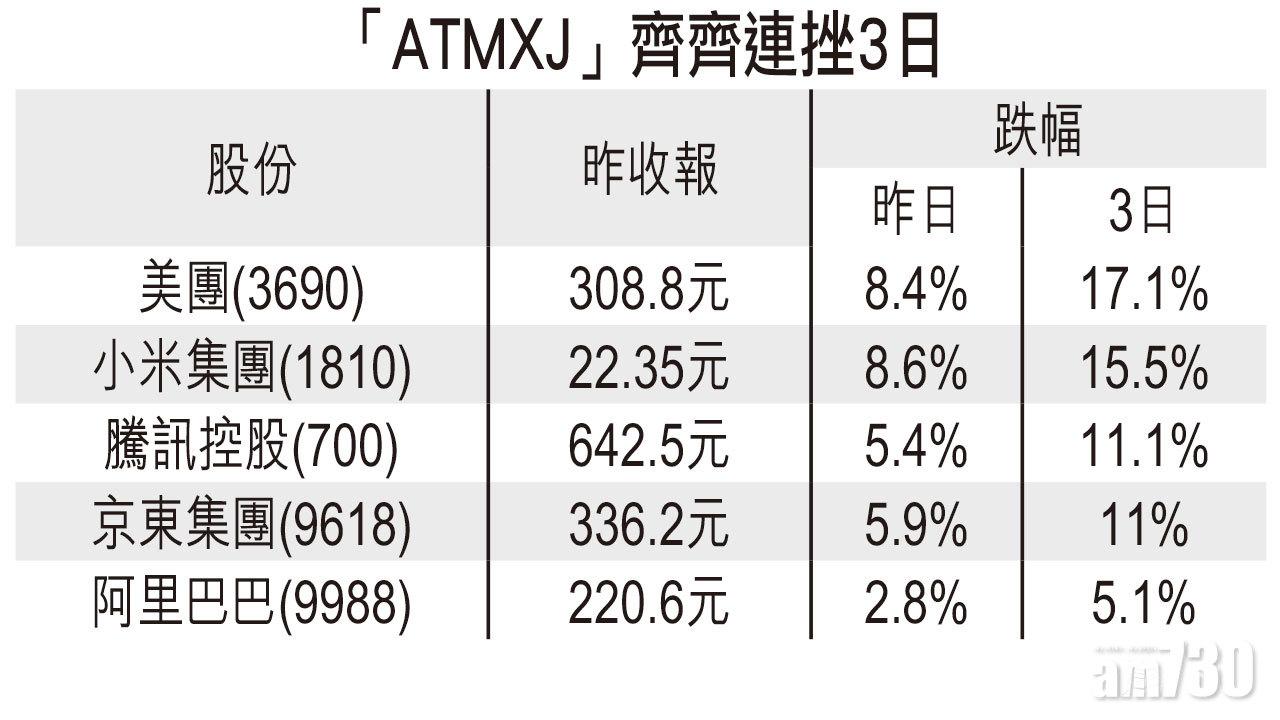 32隻科指成分股昨全數報跌,微盟集團(2013)、心動公司(2400)及京東健康(6618)跌幅均逾一成,當中微盟瀉13.9%,成交額更高達17.2億元。「ATMXJ」全數連挫3日,昨以小米集團(1810)最重傷,大跌8.6%,3日失15.5%;美團(3690)單日急挫8.4%,3日跌17.1%,京東集團(9618)及騰訊控股(700)昨均跌逾半成。今年已倒跌的科指成分股亦有17隻,佔53%,當中包括阿里巴巴(9988)、京東及小米。