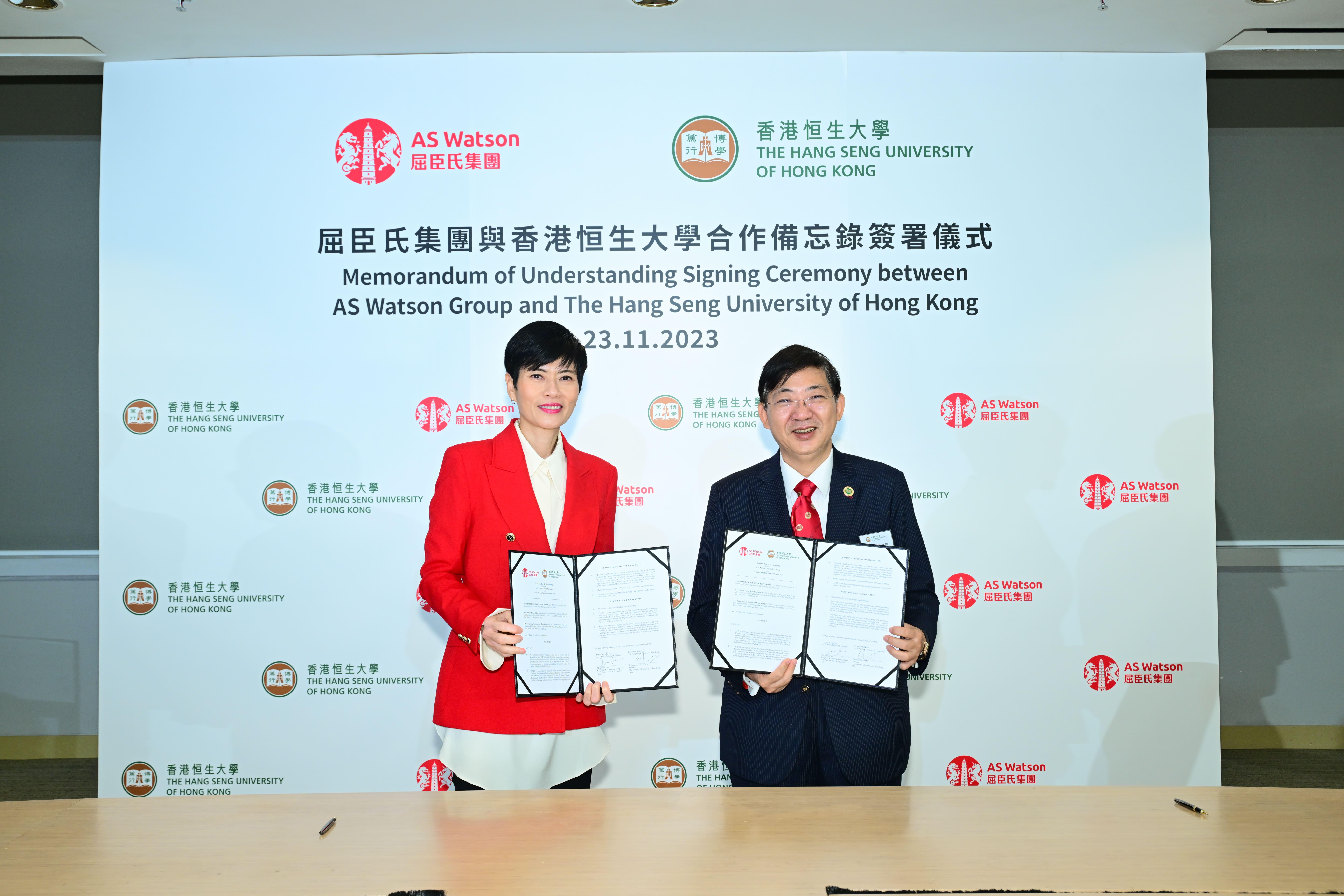 恒生大學校長何順文教授與屈臣氏集團首席營運總監及屈臣氏集團(亞洲及歐洲)行政總裁倪文玲女士簽署合作備忘錄。