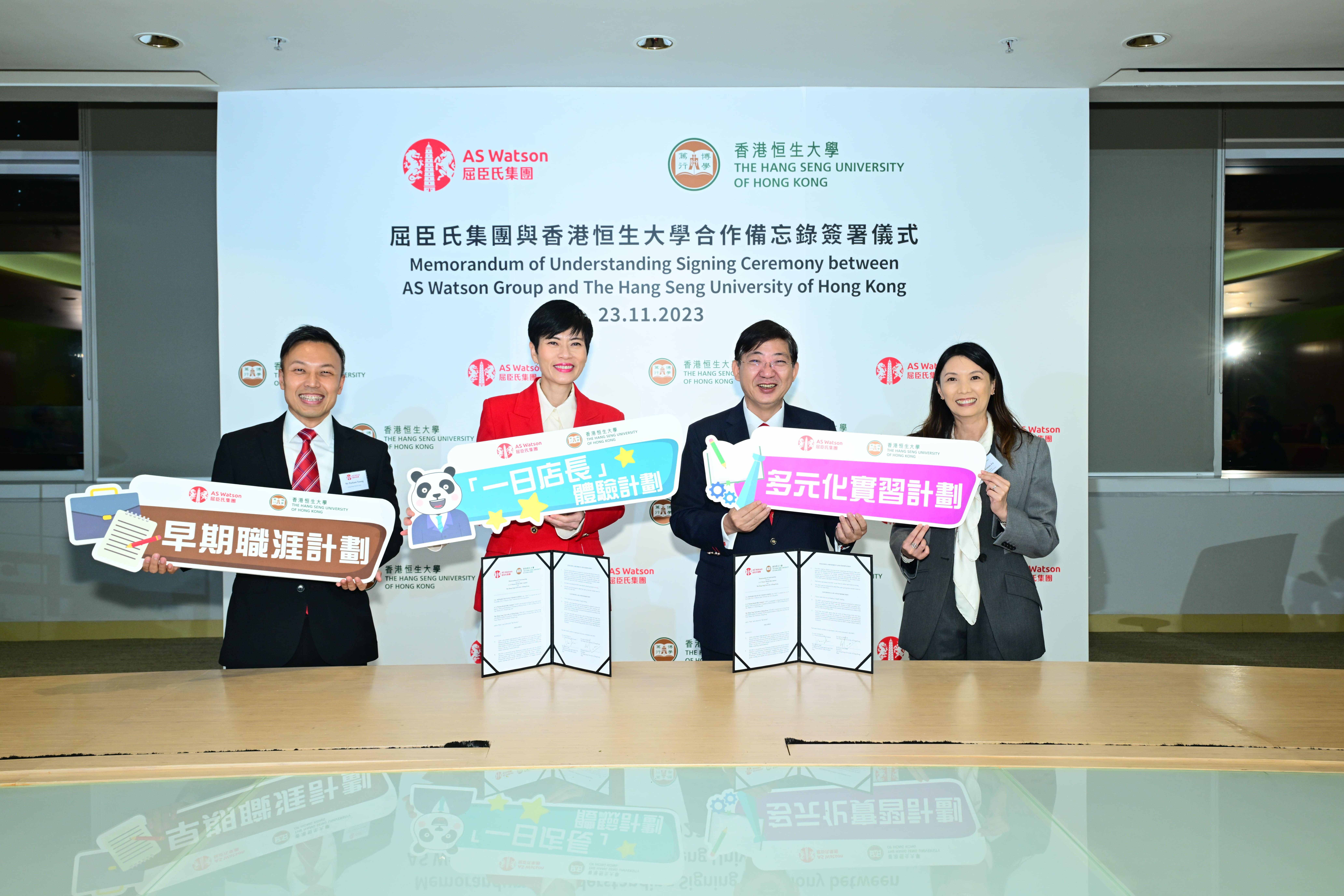 合作備忘錄由恒生大學校長何順文教授與屈臣氏集團首席營運總監及屈臣氏集團(亞洲及歐洲)行政總裁倪文玲女士簽署。何校長致辭表示,深信通過計劃,可培育更多具備明辨思維、創新力量、人文關懷、道德價值和社會責任的專業人才,亦共同為零售業界培育更多未來行業領袖