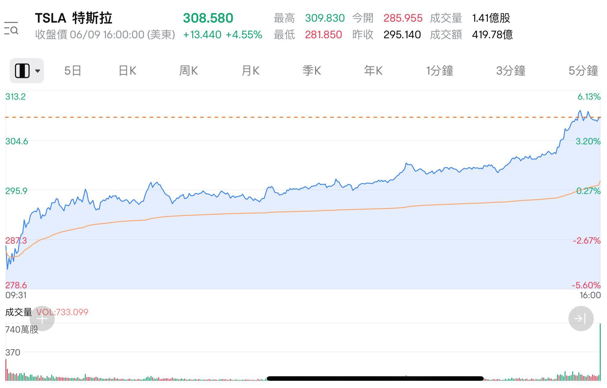 受上述消息提振,特斯拉股價周一收漲4.6%或13.44美元,重上300美元,報308.58美元,盤前升近2%,報314.58美元。上周四,隨著特朗普和馬斯克的「口水戰」升級,特斯拉股價下跌逾14%,市值蒸發了1,520億美元,創下史上最大單日跌幅。