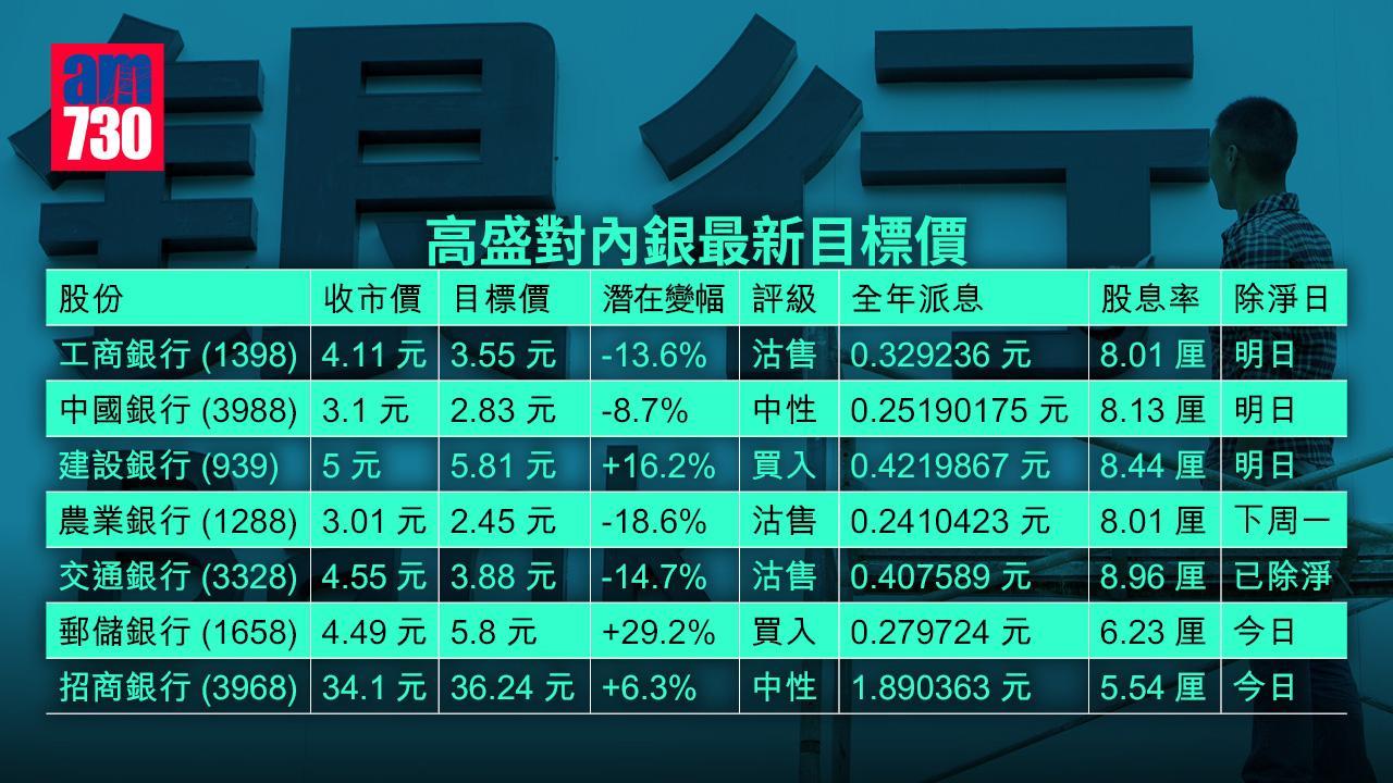 高盛報告內指出,認為內銀每股派息未來兩年將有8%及15%下降,主要由於內銀派息率平均少3至4個百分點。不過高盛強調,仍然相信大部分內銀能維持股息,只係派息分歧會漸見擴大。