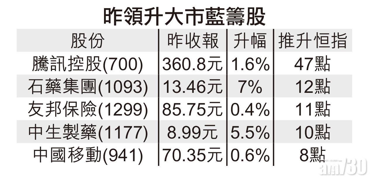 國企股指數昨跑贏升0.5%或50點,報10,838點,大市主板成交額714億元。除騰訊外,醫藥股亦為大市助燃,市傳內地「帶量採購」10月推,但只限中標25藥品,且下輪計劃需待明年才進行,觸發石藥集團(1093)及中國生物製藥(1177)分別飆7%及5.5%,成表現最好藍籌。相反百威亞太擱置上市後港交所(388)走弱,昨逆向挫1.2%。