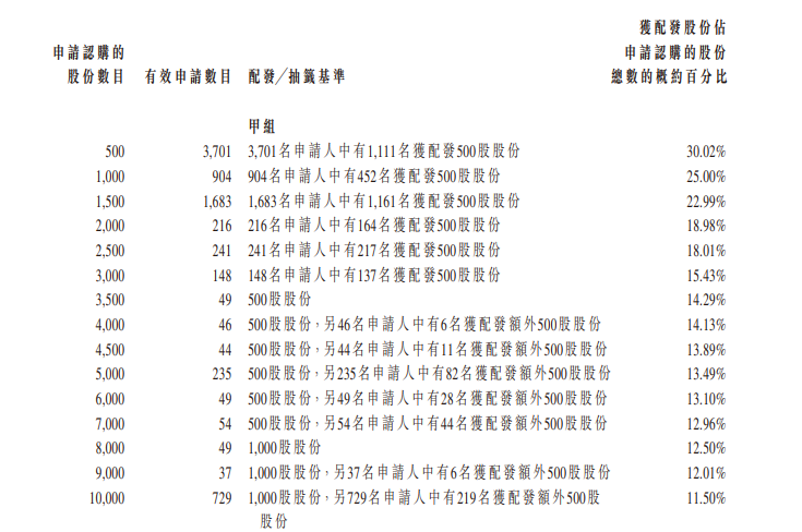 巨星傳奇周三(12日)公布招股結果,重新招股的巨星傳奇,發售價再減至4.25元,集資淨額2.45億元。結果顯示,一手中籤率為30.02%,即抽7手約3,500股,即可穩獲一手。