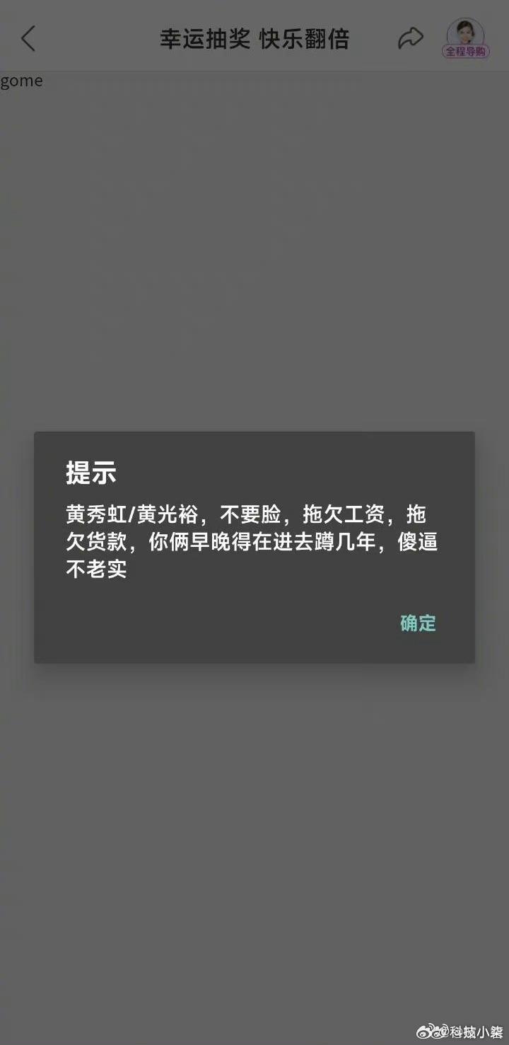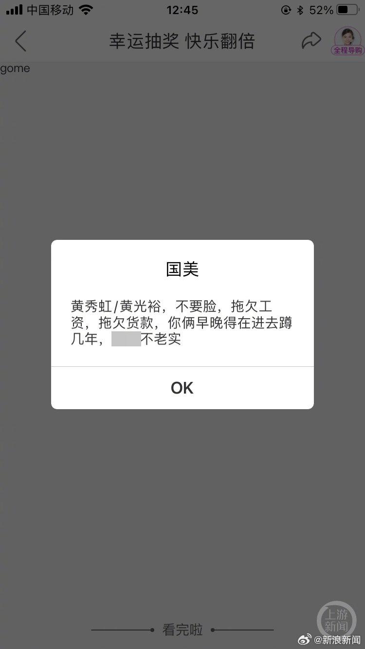 內媒《上游新聞》報道,近日有用戶發現點擊國美App內的「會員俱樂部」頁面的「幸運抽獎」時,會出現彈窗寫上「黃秀虹/黃光裕,不要臉,拖欠工資,拖欠貸款,你倆早晚得在進去蹲幾年,XX不老實」。