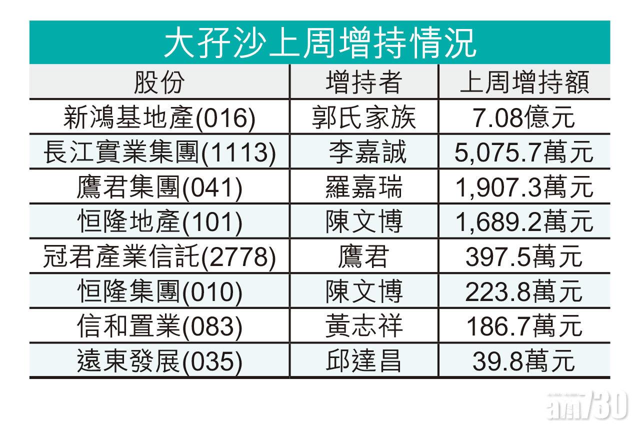港股上周瀉2.9%或728點,至24,192點,連續兩周走弱。上周藍籌十大跌幅王中,上周一曾爆小股災的本地地產股佔4席,但同時大孖沙亦出手掃貨,當中以新鴻基地產(016)郭氏家族豪斥逾7億元托價最闊綽,連同其他地產商的出手,上周大孖沙共斥逾8億元掃貨,但地產股股價仍未見明顯反彈。分析認為板塊負面消息短線難見扭轉,相信股份「有反彈無升幅」,未到撈底時。