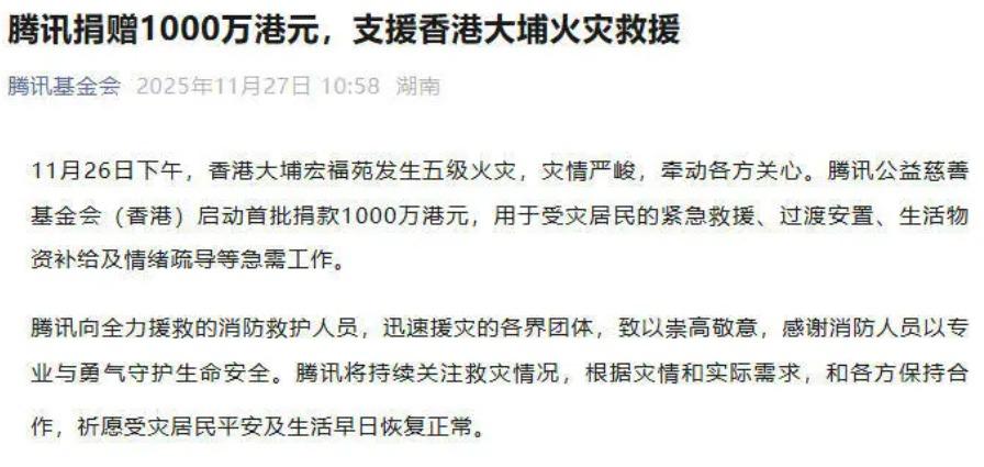 騰訊公益慈善基金會啟動首批捐款1,000萬元,用於大埔火災居民的緊急救援、過渡安置、生活物資補給及情緒疏導等急需工作。騰訊(700)表示,將持續關注救災情況,根據災情和實際需求,和各方保持合作,祈願受災居民平安及生活早日恢覆正常。