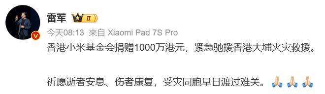 小米(1810)創辦人雷軍在社交媒體上公布,香港小米基金會捐贈1,000萬元,緊急馳援大埔火災救援。雷軍亦表示,祈願逝者安息、傷者康復,受災同胞早日渡過難關。