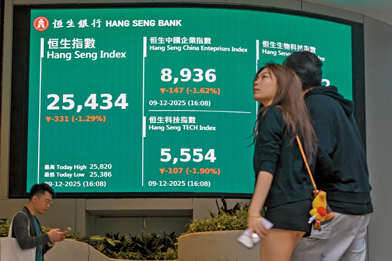 港股連挫兩日,恒生指數昨再跌331點或1.3%,至25,434點,兩日累失651點。市場對港股明年保持樂觀,滙豐私人銀行料明年底恒生指數目標為31,000點;富途證券恒指明年目標亦為31,000 點,並認為若宏觀經濟環境改善並且整體企業盈利持續增長,樂觀情境下目標有望可達34,000點。