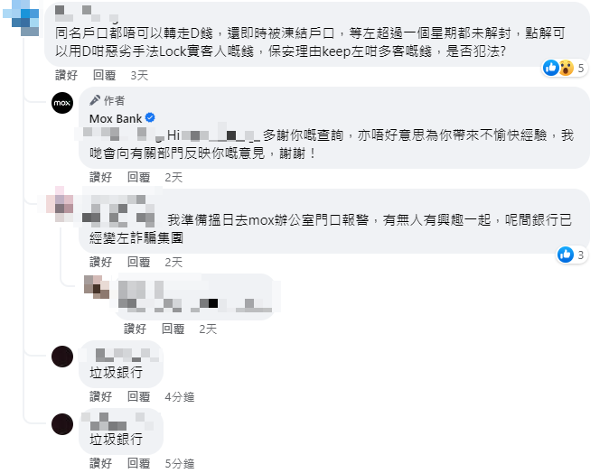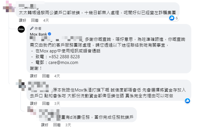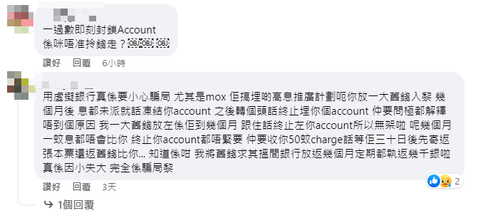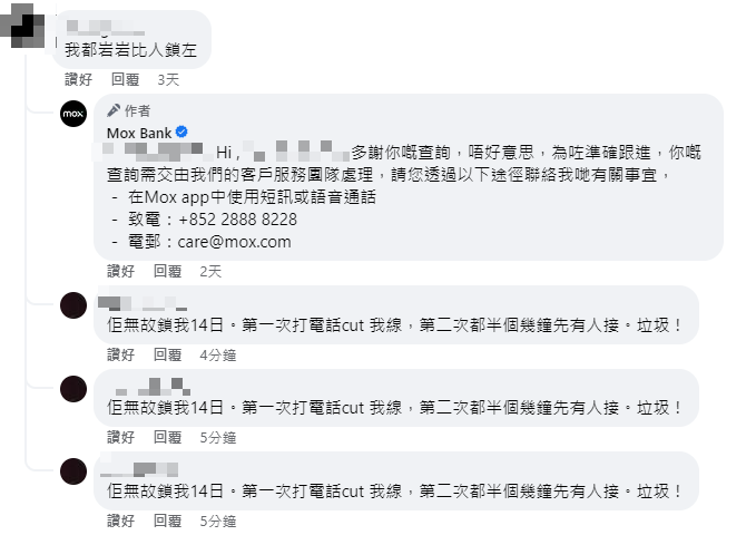 有Mox Bank用戶在其社交平台專頁留言,指自己的銀行賬戶遭無故凍結,而且無法調動資金,有人不滿而投訴,「鎖咗成個星期lock住啲錢,等緊用嚟找數」;亦有人表示Mox方面未有詳細解釋原因,「cs原因佢只答security reason(保安問題) ,話系統有時會係咁, 等佢開返要等5-7 working days(5至7個工作天)」。