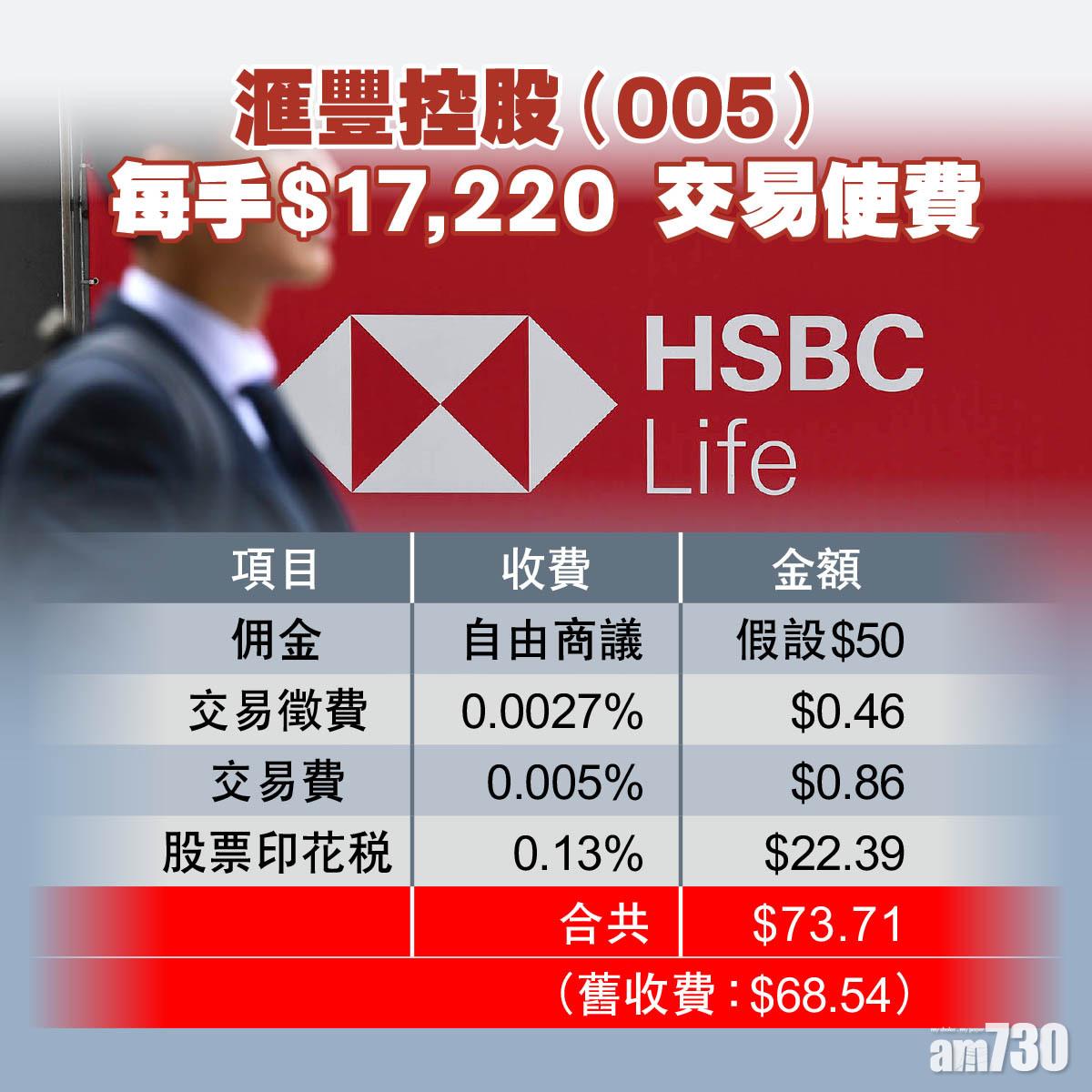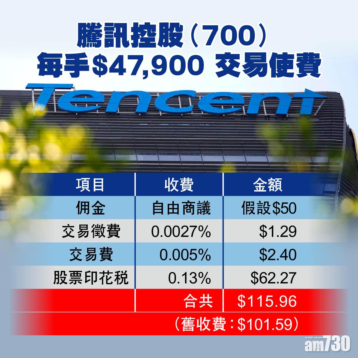 除向政府繳交股票印花稅外,買賣股票仍需向經券行或銀行繳交經紀佣金、另向證監會繳交交易徵費0.0027%,港交所(388)亦會收取交易費0.005%。假設經紀佣金50元,騰訊及滙控每手買賣交易使費如下: