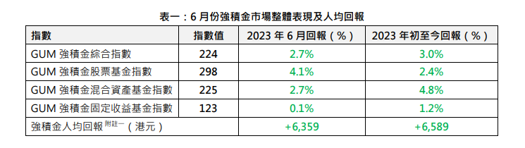 GUM公布,6月份MPF強積金三大基金指數皆上升,其中股票基金為各個類別中最好。股票基金指數上升4.1%;混合資產基金指數升2.7%;固定收益基金指數升0.1%。
