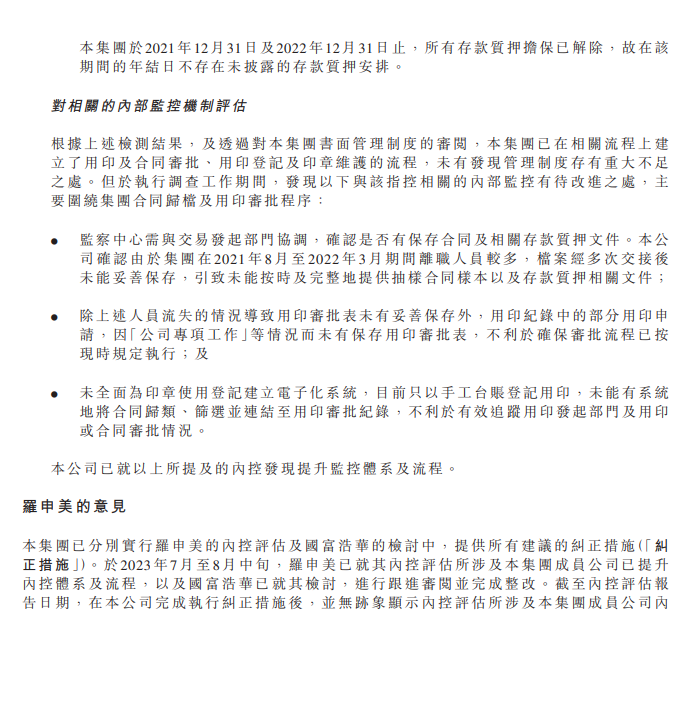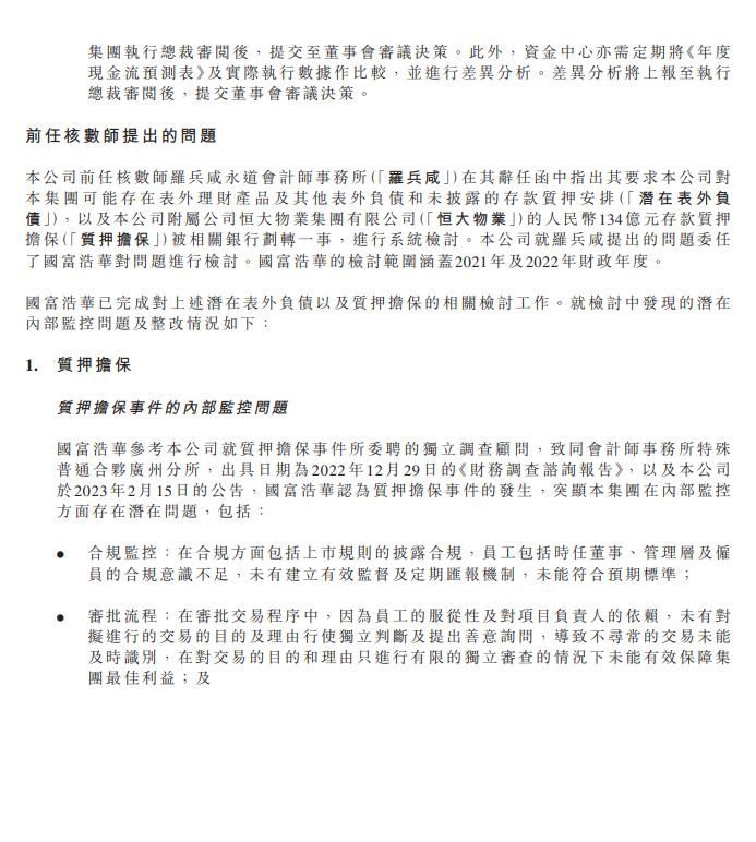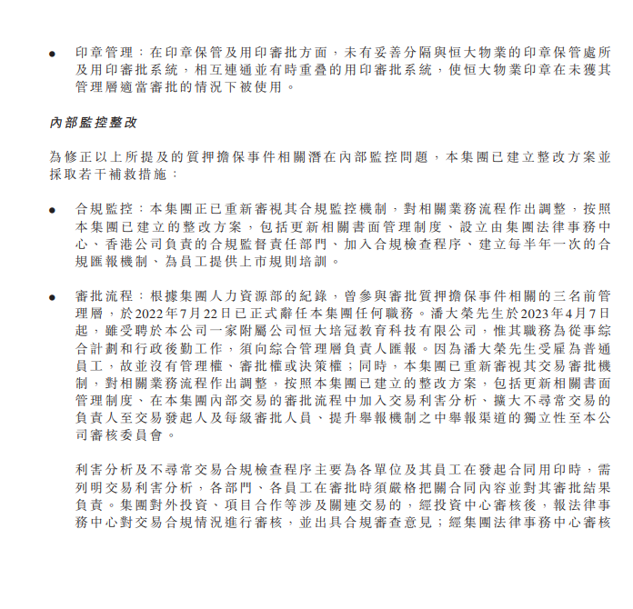 恒大指,已分別實行羅申美的內控評估及國富浩華的檢討中,提供所有建議的糾正措施,並於今年7月至8月中旬提升內控體系及流程,國富浩華亦已就其檢討進行跟進審閱並完成整改。截至內控評估報告日期,恒大完成執行糾正措施後,並無跡象顯示「內控評估所涉及集團成員公司內控體系及流程存在任何重大缺陷」。