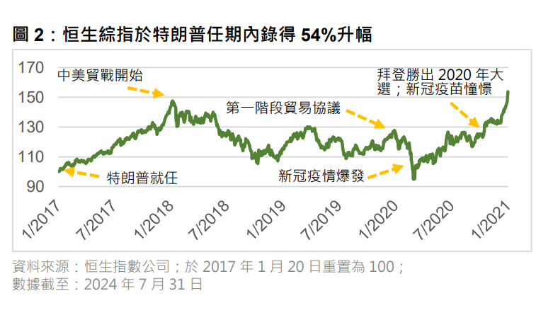 恒指公司報告表示,由特朗普2017年1月20日就任開始,恒指表現其實相當亮眼,先在特朗普任期內首年錄得逾43%的升幅。然而,隨著美國於2018年1月起對中國貨品加徵關稅,導致貿易戰爆發後,投資氣氛受損下港股亦因而下跌。由美國對中國貨品加徵關稅開始到2020年1月雙方簽署第一階段貿易協議期間,恒指錄得逾12%跌幅。