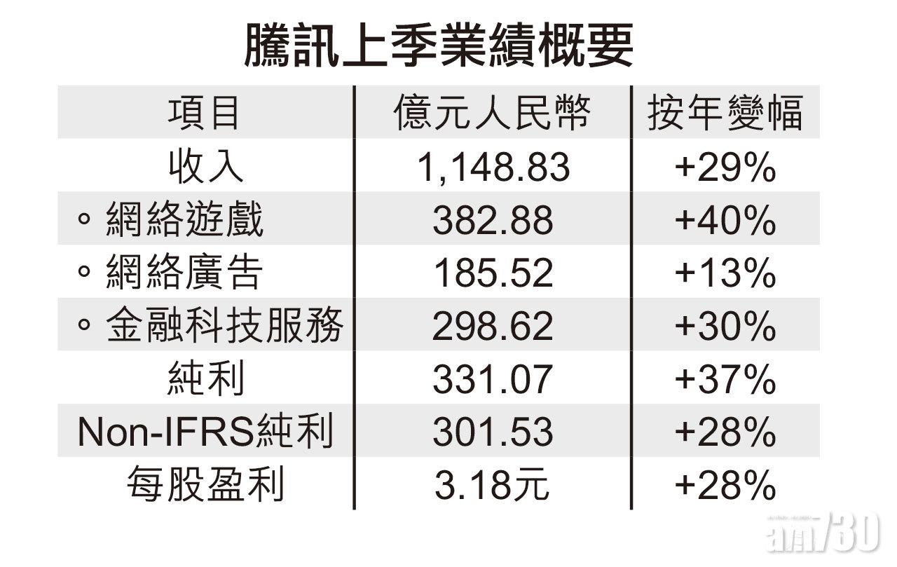 集團上季收入1,148.83億元,多29%,經營盈利393.11億元,上升43%。期內網絡遊戲收入增長40%,至382.88億元,主要受《和平精英》及《王者榮耀》推動,手遊收入則錄359.88億元,大增62%;在雲業務及理財平台貢獻下,金融科技及企業服務業務收入亦大漲30%,至298.62億元;至於網絡廣告業務收入則升13%,至185.52億元。