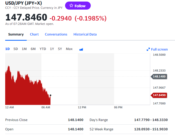 對沖基金縮淡倉、資產管理公司增淡倉後,美元兌日圓見147.84水平;日圓兌港元則小幅上升,每百YEN兌港元則見5.26算。