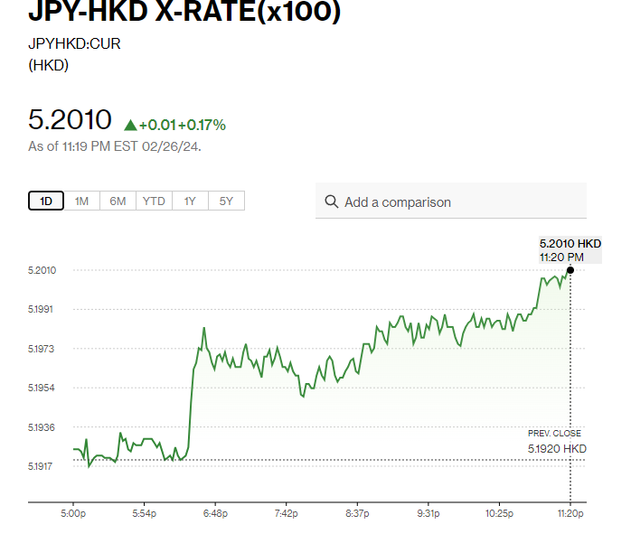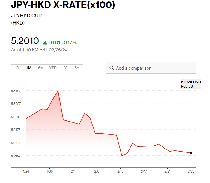 日圓匯率走勢|日本1月核心CPI上升2%勝預期,YEN兌港元5.19算。