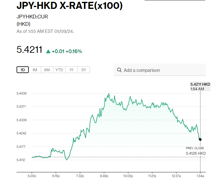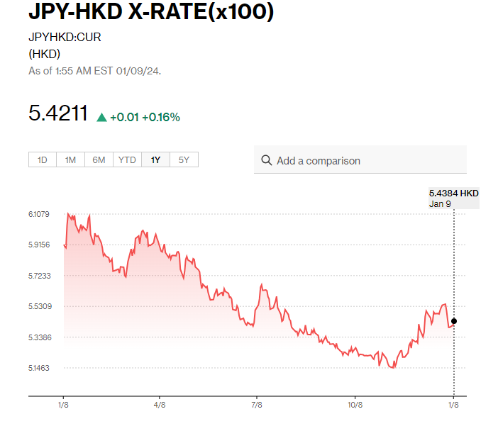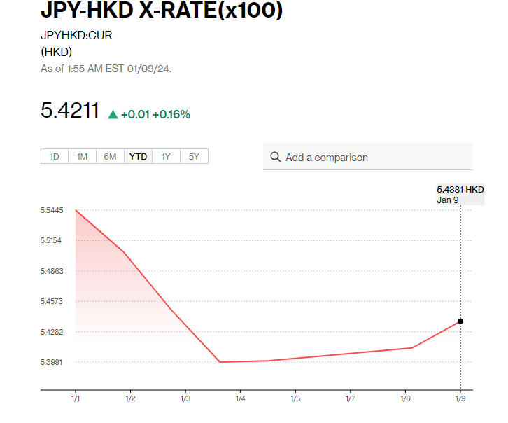 日股再創高位期間,日圓匯率近日有所下跌,日圓兌美元見144.05水平;每百日圓兌港元回落至5.42算。