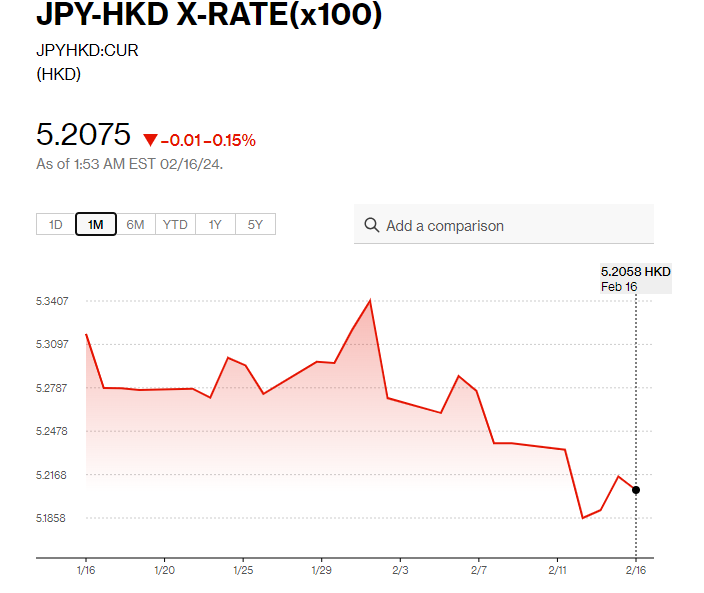 植田和男「放鴿」後,日圓偏軟。截至2月16日下午,每美元兌日圓仍處150水平,報150.21,升0.19%;每百日圓兌港元則見5.2算,跌0.15%。