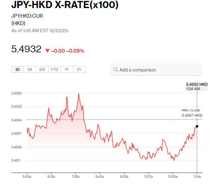 現時日圓(Yen)兌美元見142.26水平;每百日圓兌港元逼近5.5算,現報5.4933算。