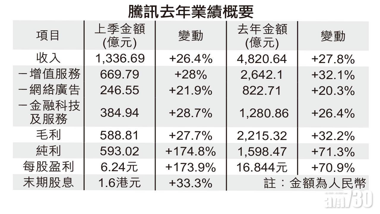 業績方面,騰訊去年第四季純利593.02億元(人民幣,下同)(約707.2億港元),按年大增1.75倍,按季增53.8%,表現勝預期,非國際財務報告準則純利332.07億元,上升30%,收入1,336.69億元,多26%。全年計,騰訊去年純利1,598.47億元,多71.3%,非國際財務報告準則純利1,227.42億元,增30.1%,收入4,820.64億元,上升27.8%,每股盈利16.844元,擬派末期股息1.6港元,多33%。