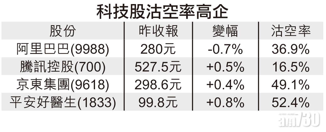 不過科技股愈升就愈受淡友覬覦!大市昨沽空額115.7億元,佔主板成交比率13.3%,當中阿里已佔16.1%;其次京東集團(9618)沽空率更由一至兩成,大增至昨日高達逾49%極高水平;平安好醫生(1833)沽空率連續3日高至五成,昨錄52.4%。恒生科技指數ETF(指數買賣基金)亦成目標,安碩恒生科技(3067)沽空率達57.7%。