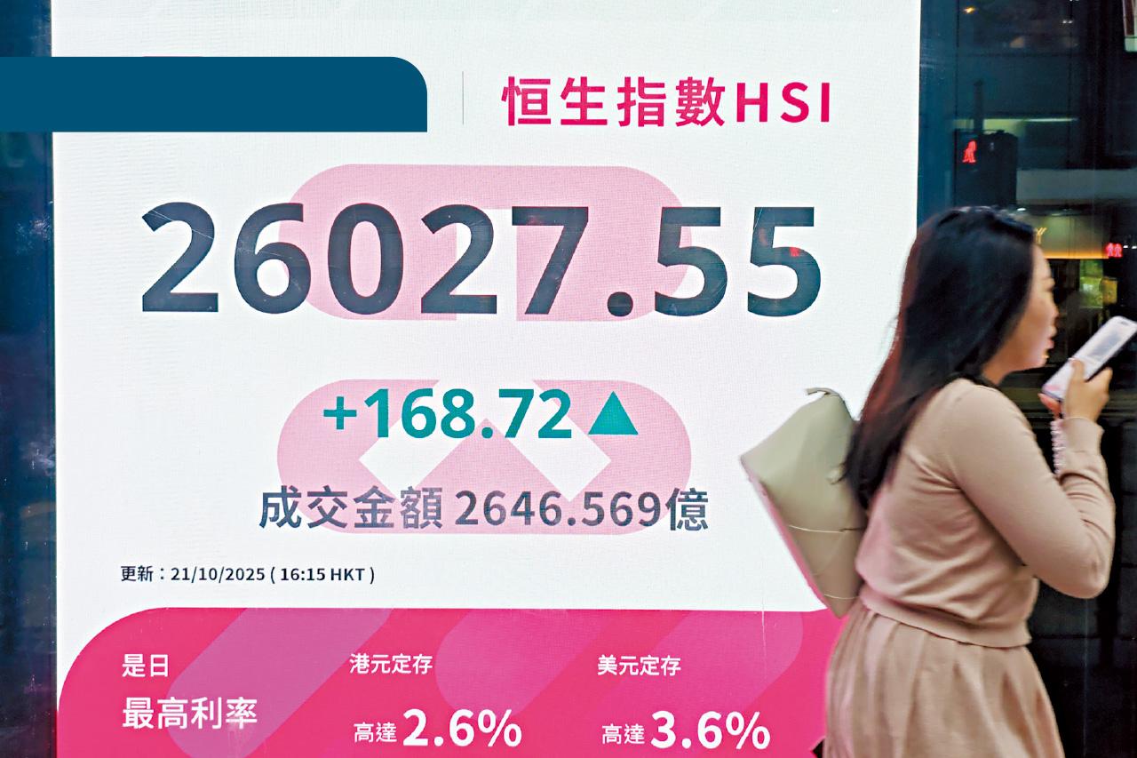 恒指兩日累升780點,重上二萬六大關。(中新社)