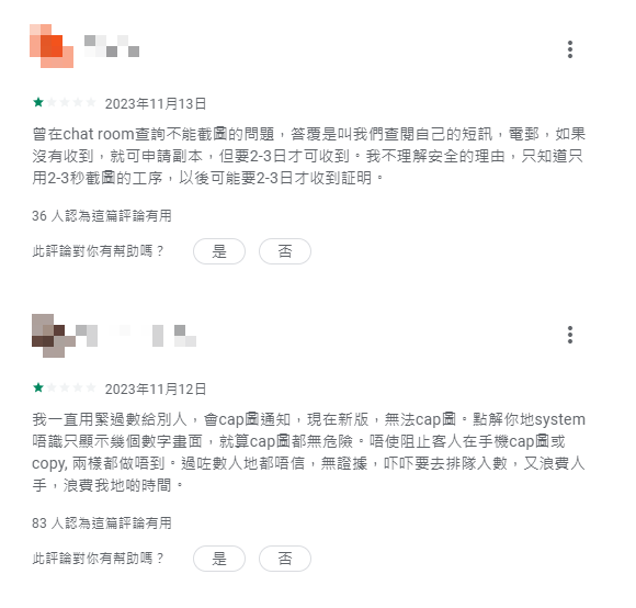 在Android用戶使用的「Google Play應用商店」內,不少Android用戶在應用程式下評論表達不滿,並表示應用程式不能截圖,令轉賬後無法留下記錄。