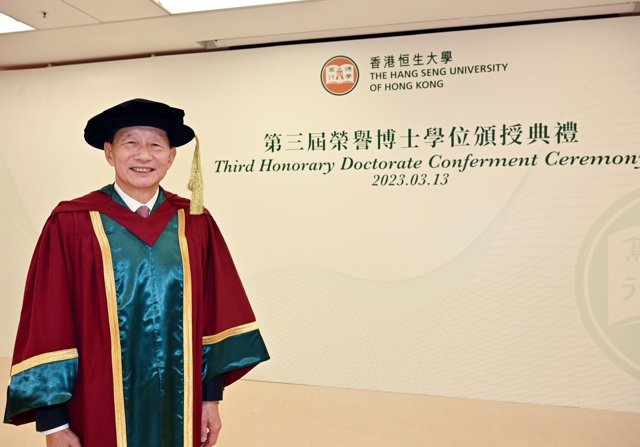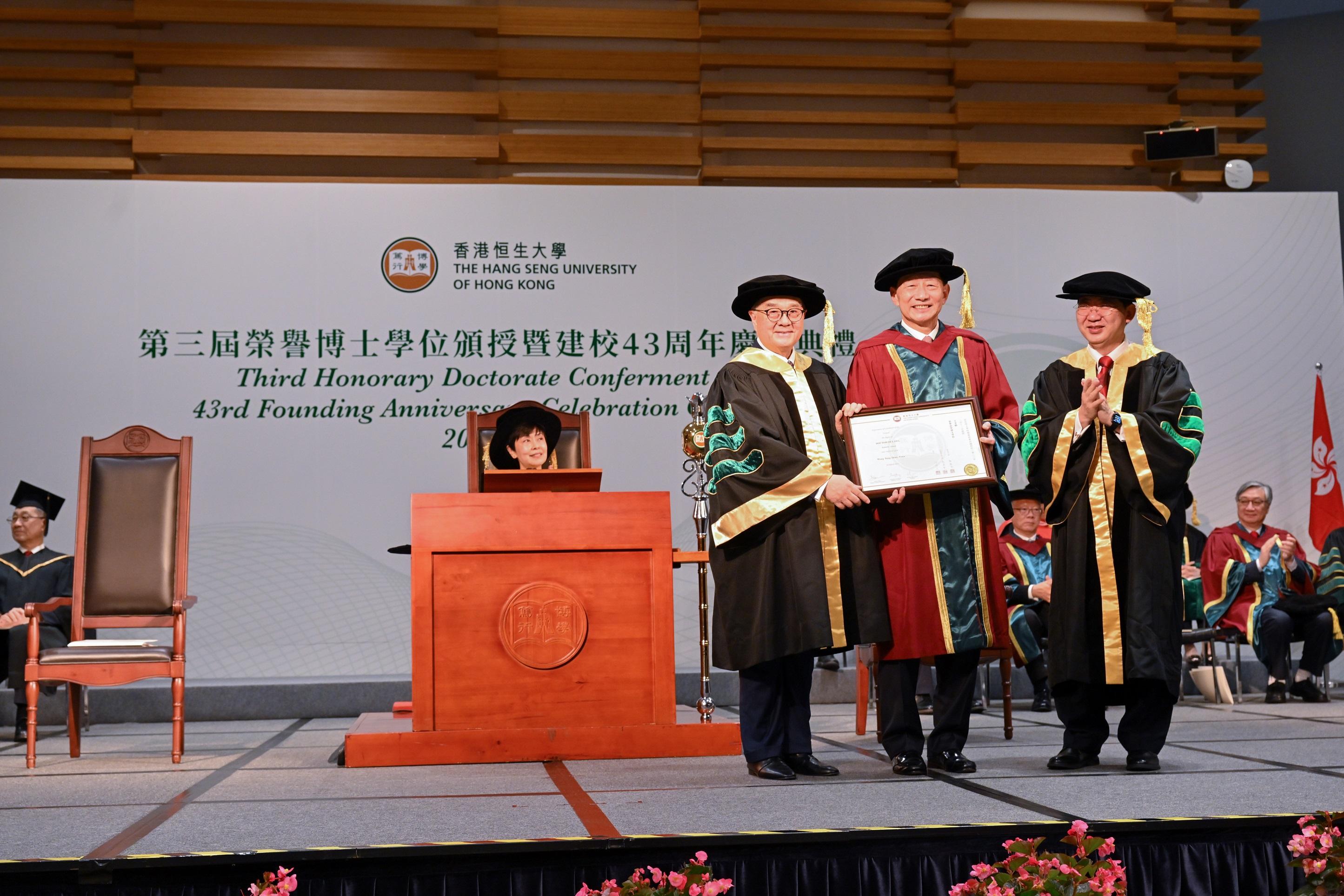 香港恒生大學今天向香港上海滙豐銀行兼滙豐銀行慈善基金主席王冬勝頒授榮譽法學博士學位。