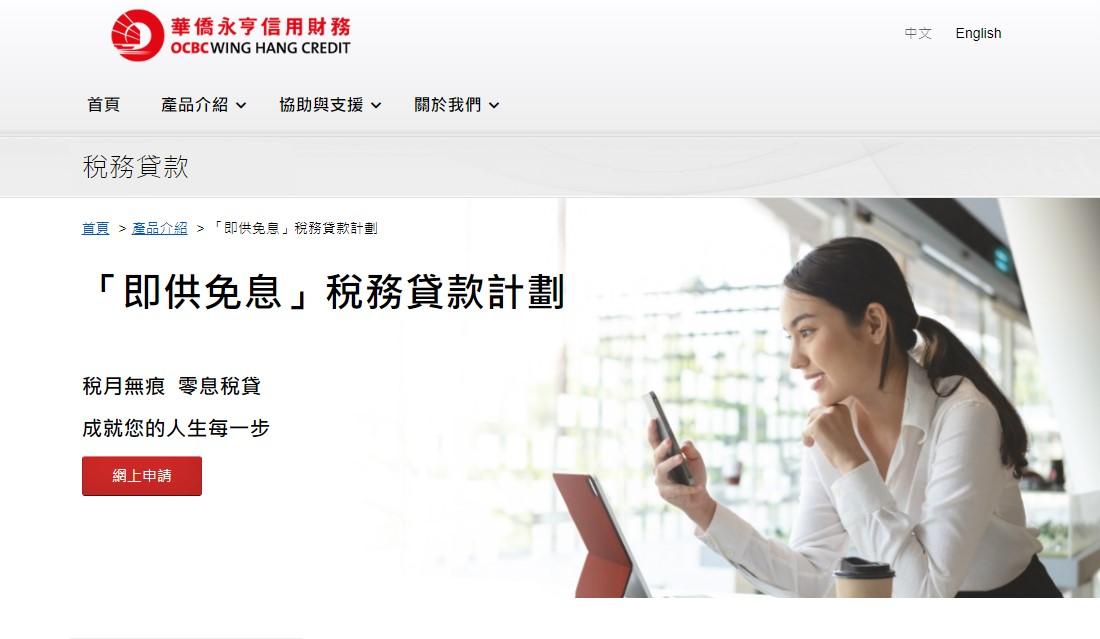 華僑永亨信用財務推出「即供免息」稅務貸款,實際年利率最低為1.68厘,每月平息零厘。貸款額最高為300萬元或月薪12倍(以較低者為準),還款期最短 為3個月至最長24個月。