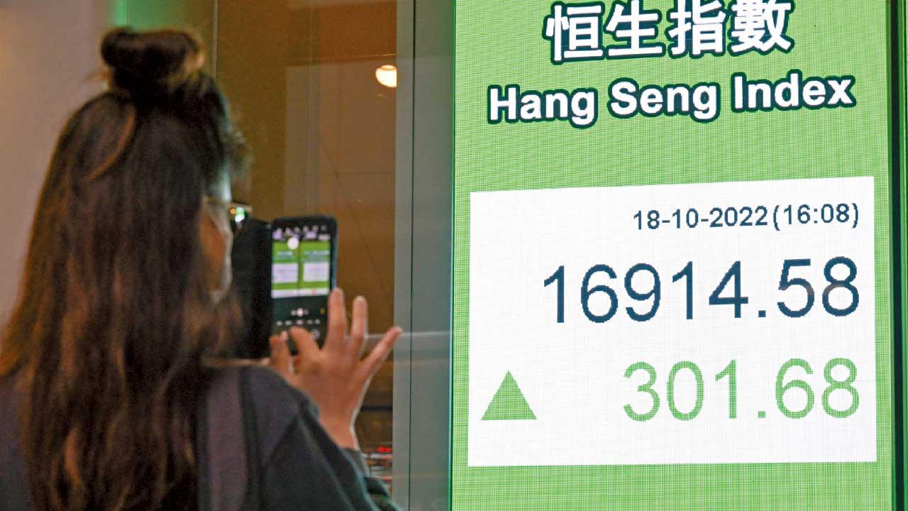 恒指連升3日,累漲525點或3.2%。(中新社)