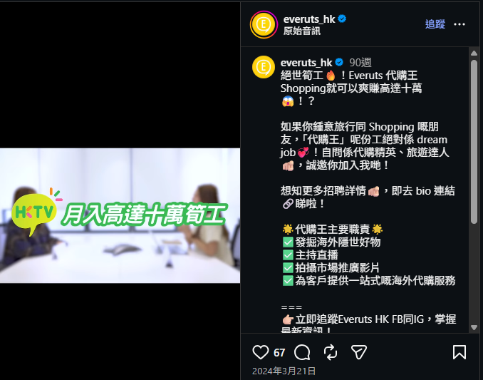 Everuts曾招募「代購王」,聲稱月薪可高達10萬元。(Everuts Instagram)