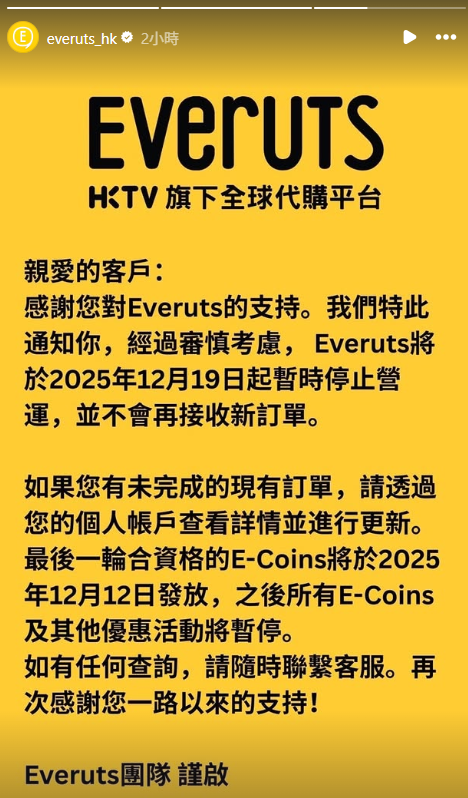 HKTVmall母企香港科技探索(1137)旗下全球代購平台Everuts宣布,經過審慎考慮,並將於2025年12月19日起暫時停止營運,並不會再接收新訂單。