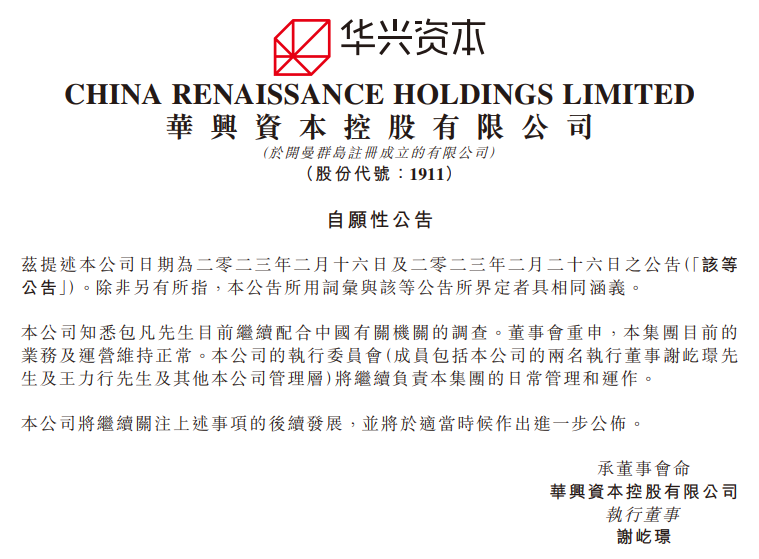 華興資本在8月曾發公告稱,董事長暨創始人包凡,仍在配合內地有關部門調查,董事會重申,集團業務及運營維持正常。(港交所)