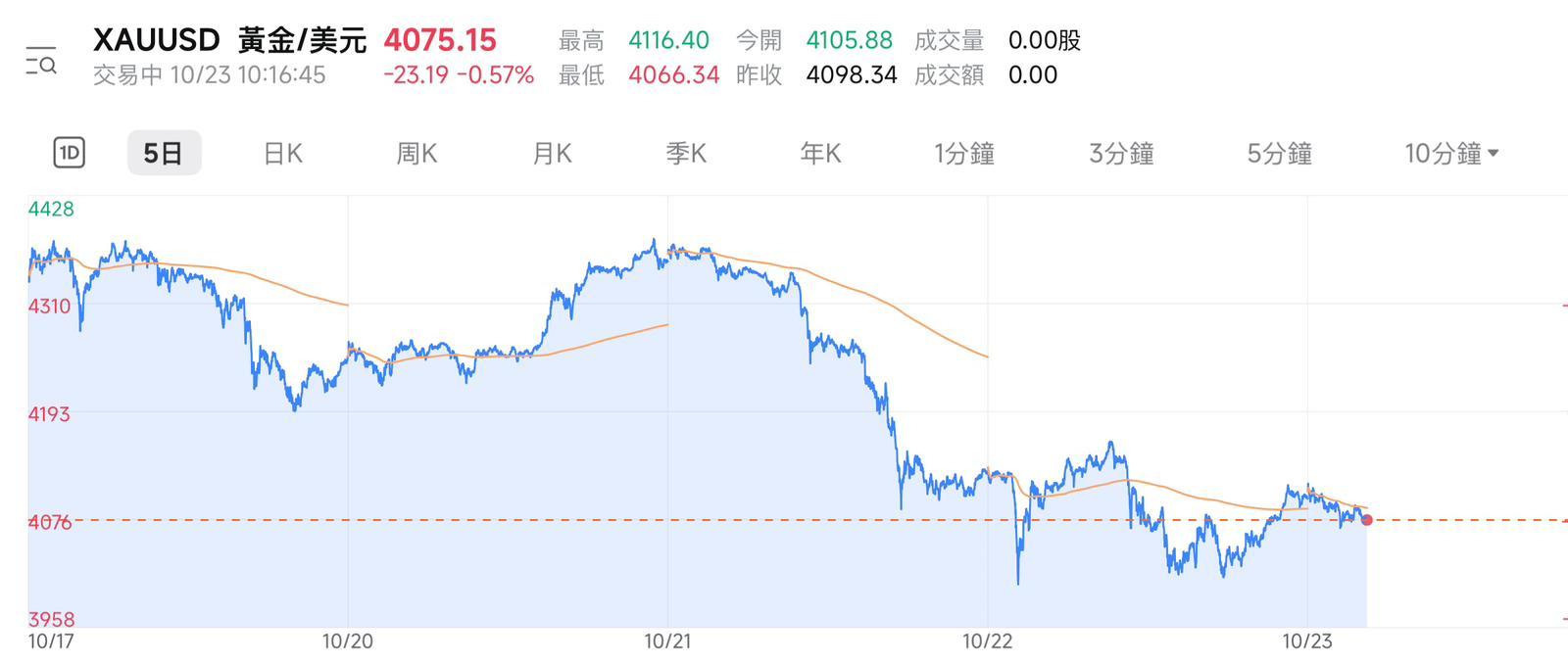 國際金價自從周一衝上歷史新高後,連續3個交易日回調。現貨金價於周四亞洲交易時段一度跌至4,066.34美元一盎司,創下逾一周以來的新低,其後於4,075美元水平徘徊,逐步逼近4,000美元大關。與此同時,紐約期金收市報4,065.4美元,跌幅達1%。