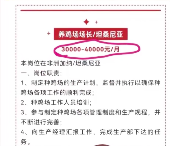 到外國出差的工作是否值得考慮?近日山東省青島市一間企業,以月薪3萬至4萬元人民幣(折合約3.4萬至4.5萬港元),招聘於非洲工作養雞場場長,引發內地網民熱議。
