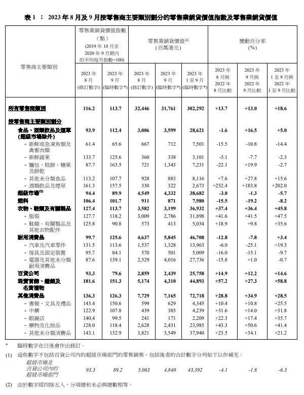 政府統計處周三(11月1日)發表最新的零售業銷貨額數字。9月零售業總銷貨價值的臨時估計為318億元,較去年同期升13%,連升10個月,惟低過市場預期。港府同時公布8月總銷貨價值的修訂估計,較去年同期增加13.7%。今年首8個月合計的總銷貨價值的臨時估計按年上升18.6%。9月的零售業總銷貨價值中,網上銷售佔11%。該月的零售業網上銷售價值的臨時估計為35億元,按年下跌22%。