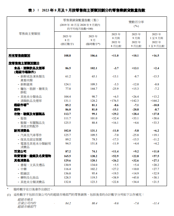 另一方面,按年的超市貨品的銷貨價值下跌1.3%。其次為汽車及汽車零件(銷貨價值下跌25.1%);燃料(下跌19.2%);以及傢具及固定裝置(下跌15.1%);而經季節性調整的零售業總銷貨價值的臨時估計下跌3.8%,而經季節性調整的零售業總銷貨數量的臨時估計則下跌4.2%。