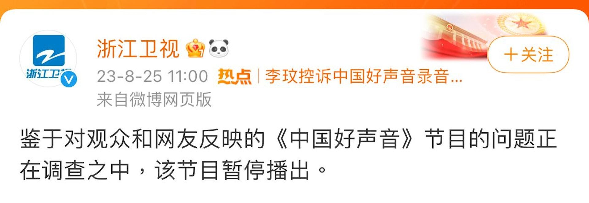 8月25日,播放《中國好聲音》的內地電視台浙江衛視宣布,「鑑於對觀眾和網友反映的《中國好聲音》節目的問題正在調查之中,該節目暫停播出。」