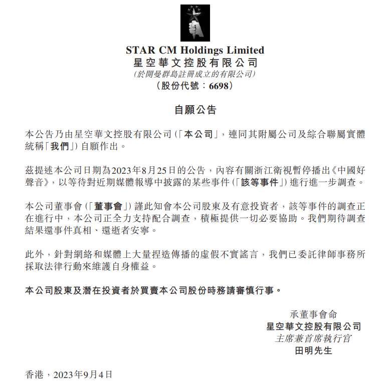 內地綜藝節目營運商星空華文(6698)製作的節目《中國好聲音》,被指對參與者不公平,更疑有已故歌手李玟流出控訴節目。星空華文於9月4日,在港交所發自願公告,表示針對網絡和媒體上傳播的虛假不實謠言,已委託律師事務所採取法律行動來維護自身權益。
