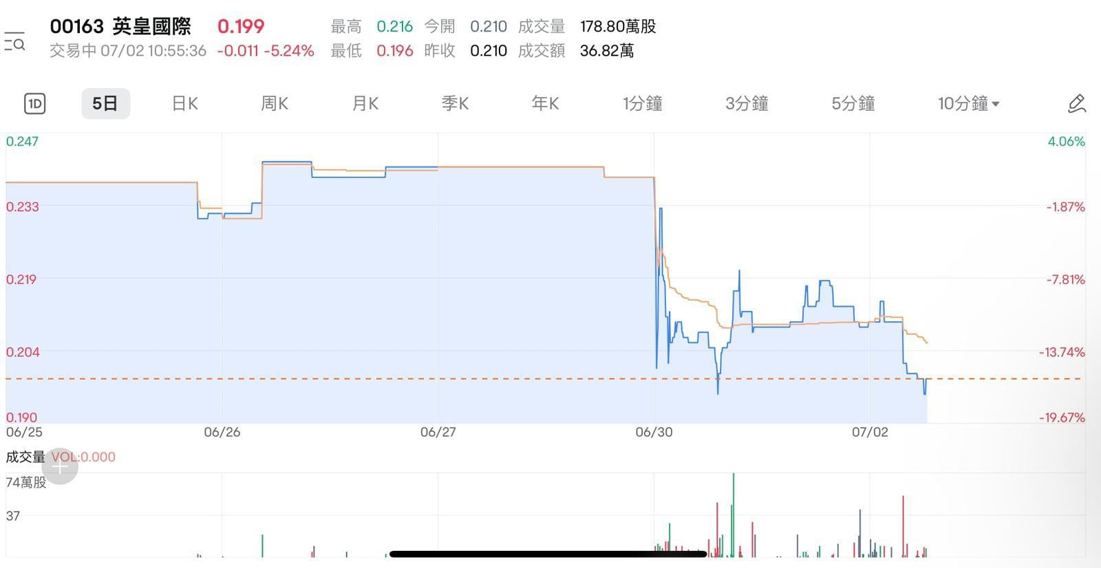【7月2日更新】「英皇系」今早在七一假期後復市全線受壓。其中英皇國際(163)繼本周一(6月30日)急挫逾11%後,股價持續走弱,半日低見0.196港元,創今年4月以來新低,該股連續兩個交易日累計跌幅逾17%。股價半日報0.198元,跌5.71%或0.012元,成交243.9萬股,涉及金額約49.84萬元。